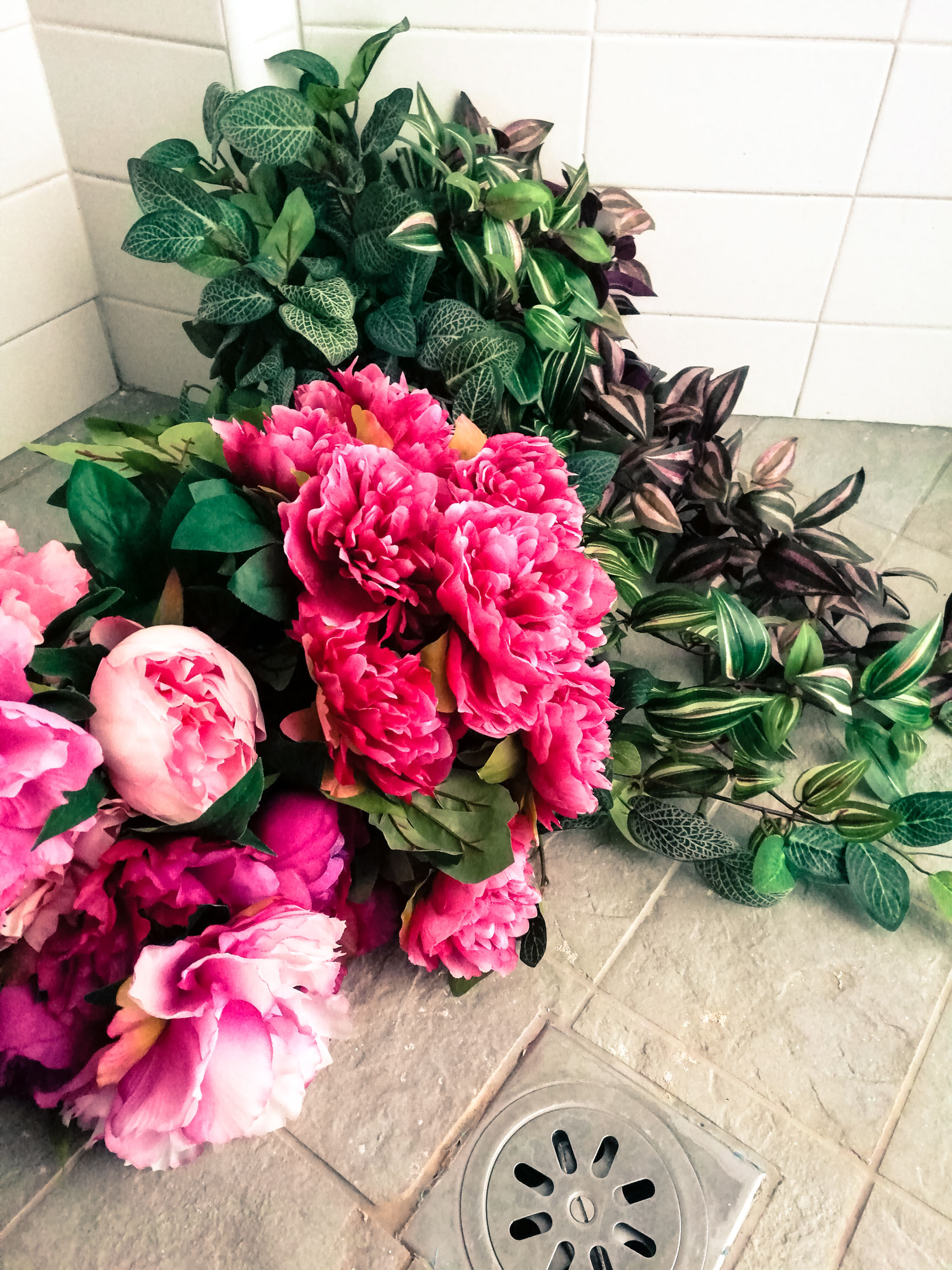La scelta è caduta sulle peonie ( vi lascio i link qui e qui ) con varie tonalità di rosa, dal pallido all’intenso, per creare un abbinamento tono su tono.