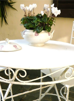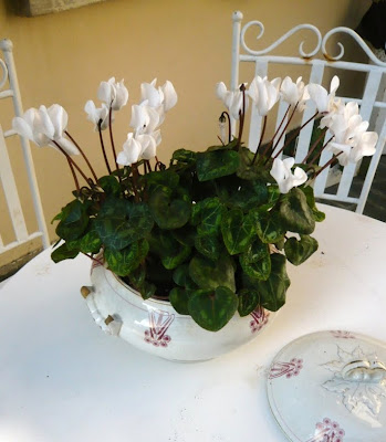 vecchia zuppiera con ciclamini bianchi a casa mia