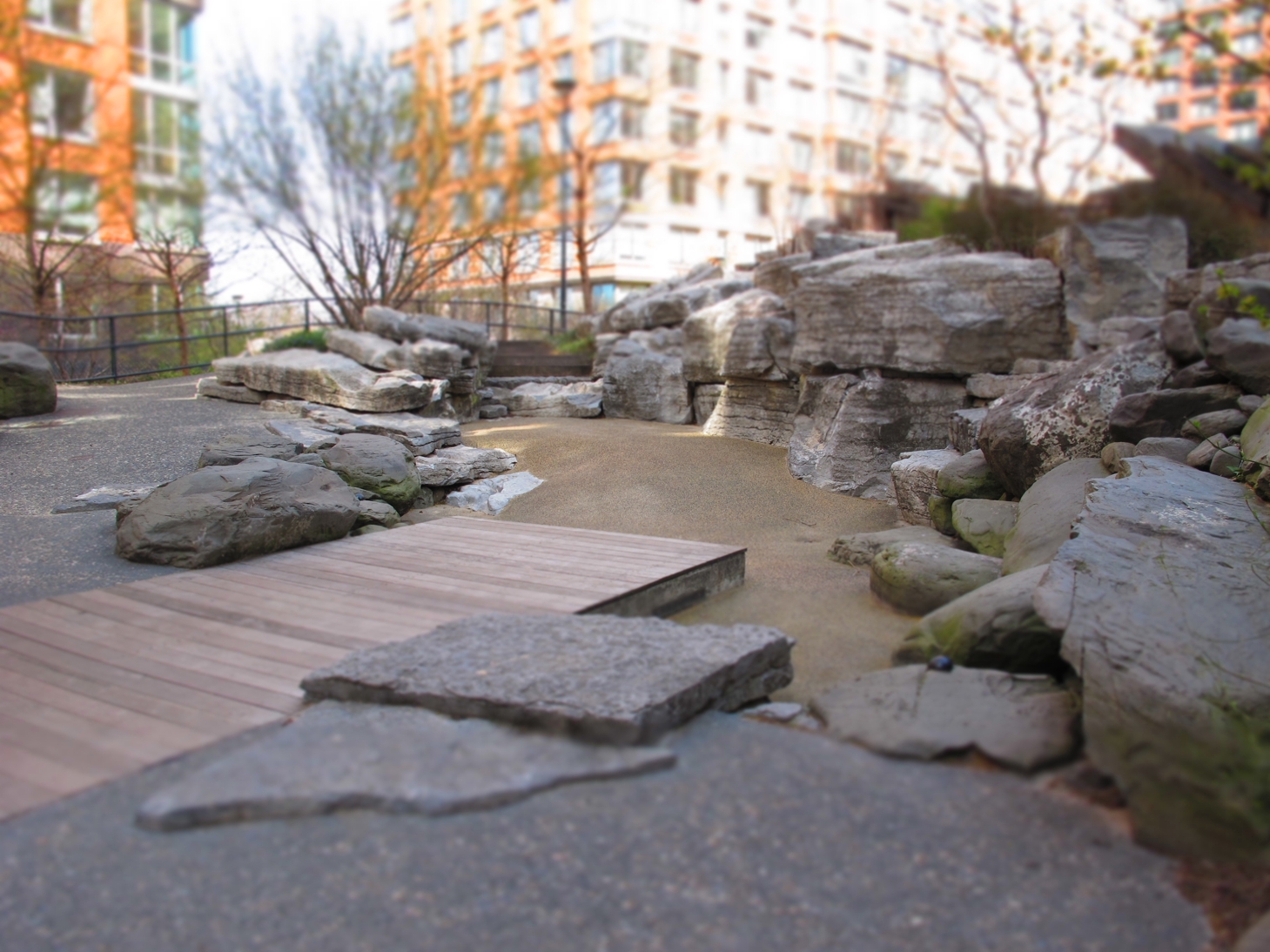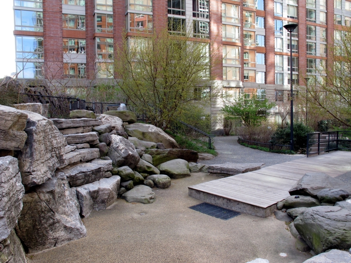 Quasi nascosto dagli alti edifici che lo circondano, questo piccolo gioiellino di giardino comprende anche una zona per bambini, con tanto di scivolo, sabbia e rocce da scalare.
