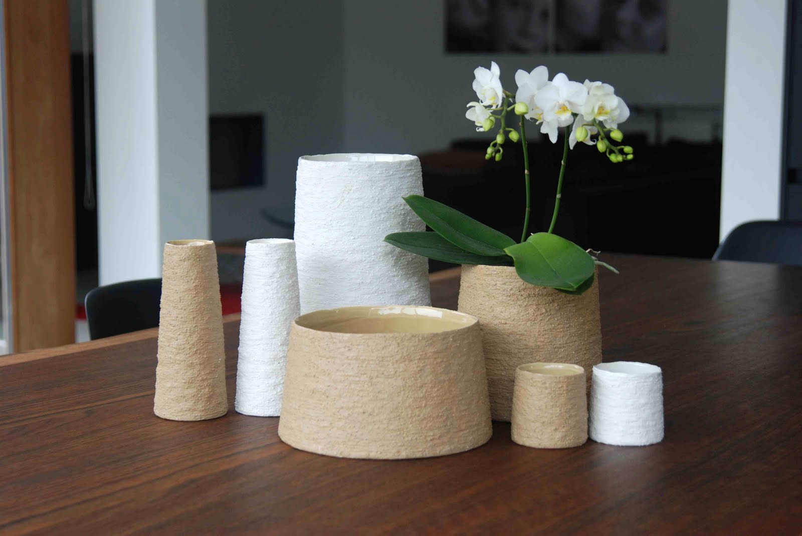 Gli elementi della linea Crepi sono disponibili in misure specifiche per il fiorista e nei colori primaverili bianco, naturale marrone-beige e lilla.