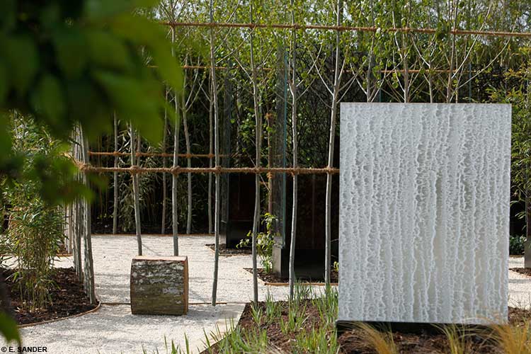 La serenita, la calma, la comunione con la natura sono i medicamenti spirituali dell’anima. Contrariamente ai giardini asciutti che si contemplano dall’esterno, in questo giardino la vegetazione protegge dal mondo il visitatore, invitandolo a un incontro molto originale con la carta, attraverso le opere e la vegetazione. Come in un giardino Zen, la ghiaia dei viali simbolizza l’acqua del fiume, in risonanza con la vita che scorre. Tre panche installate al centro del giardino e intorno ai viali invitano il visitatore a una sosta contemplativa.