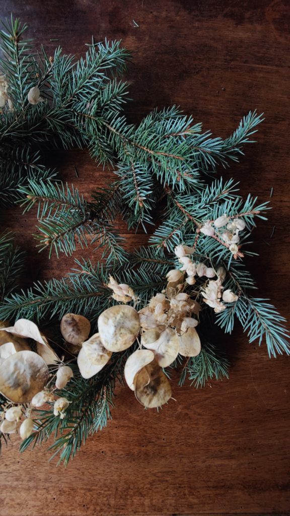 ho preferito rimanere sui toni beige dei fior secchi e del verde glauco dell’Abies