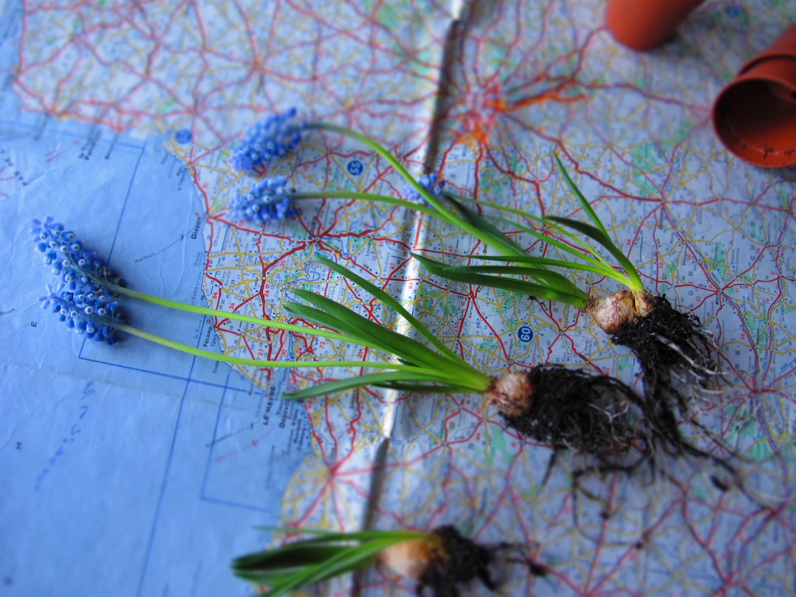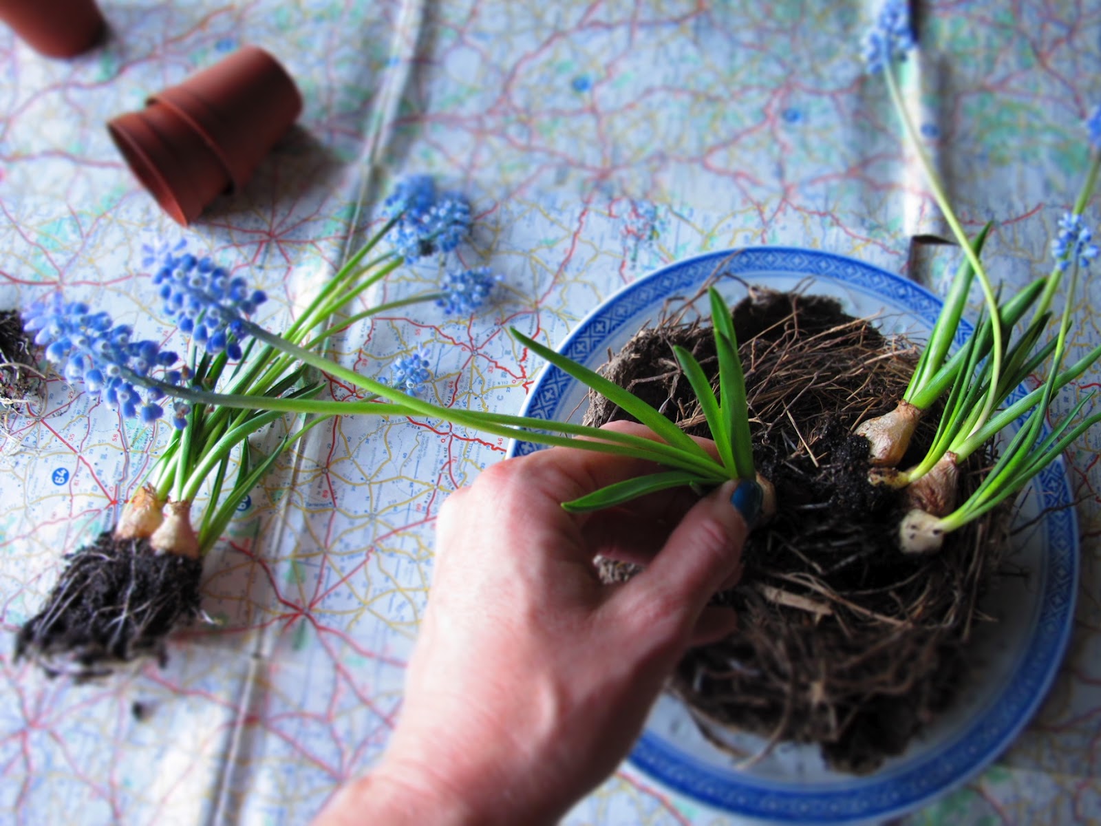 togliere dal vasetto i bulbi di Muscari, scrollare la terra in eccesso e posizionarli all’interno del nido, in questo caso utilizziamo il nido come se fosse un vaso