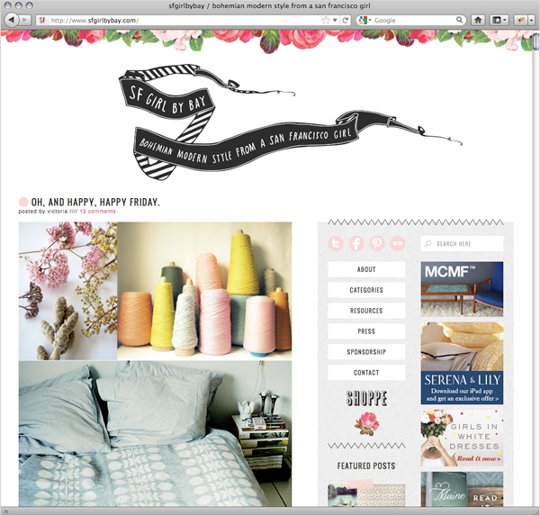 SFGIRLBYBAY is a san francisco-based blogger, photographer, photo stylist, design junkie and bonafide flea market queen. VICTORIA SMITH is editor of sfgirlbybay, one of the west coast’s leading interior design blogs, featuring new product reviews, shopping tips, including art, photography and design resources, as well as home entertaining and lifestyle stories, with a ridiculously loyal readership that includes social media butterflies, top magazine editors, shoppers, and industry professionals.