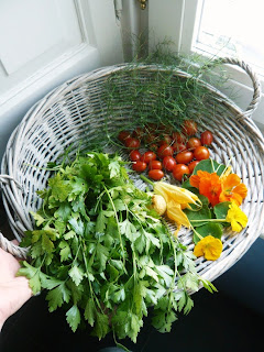 ricetta domenicale “semplice” con prezzemolo, basilico, erba cipollina, fiori di zucchina, pomodorini, fiori e foglie di nasturzi, foglie di finocchio selvatico…