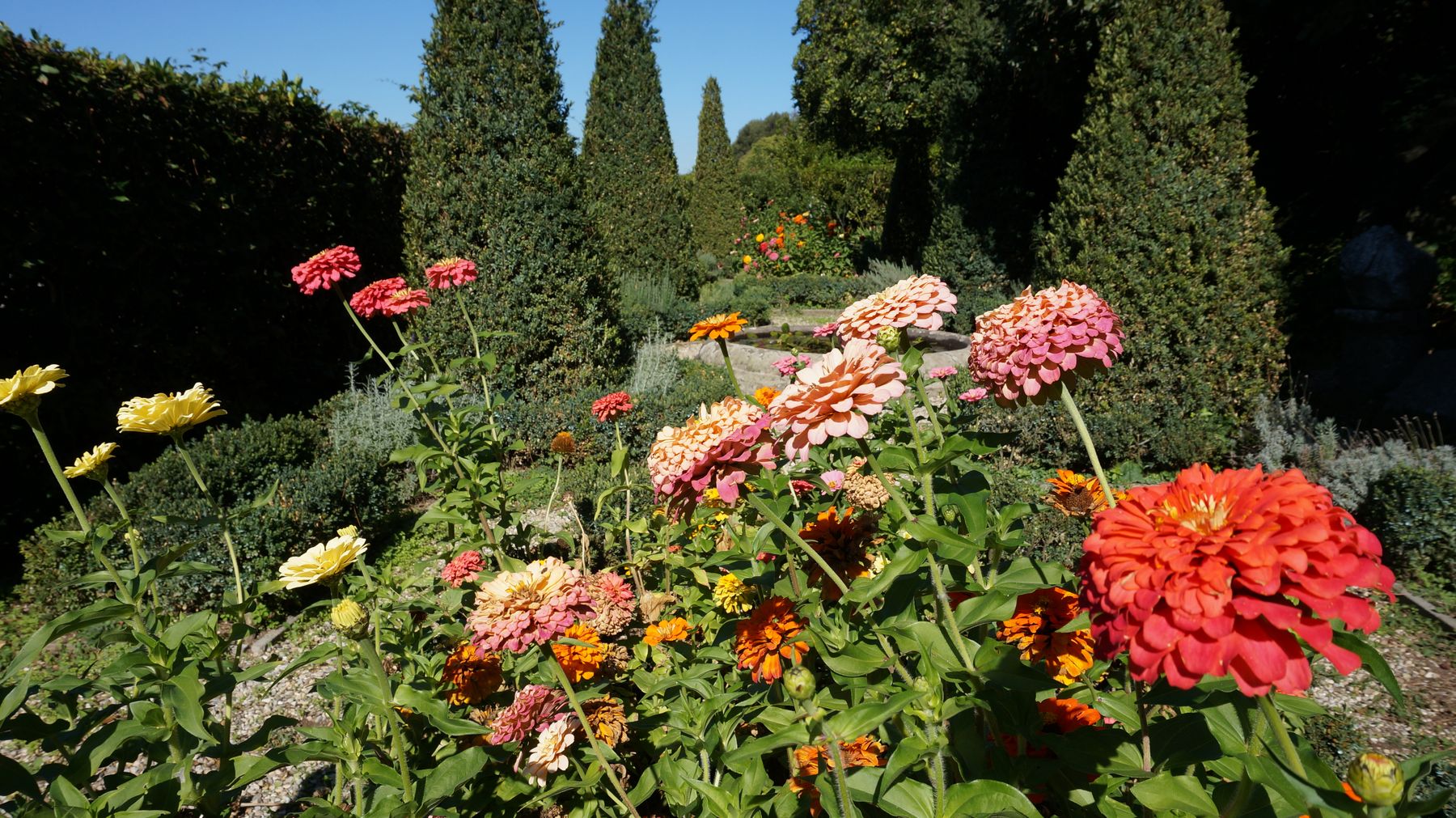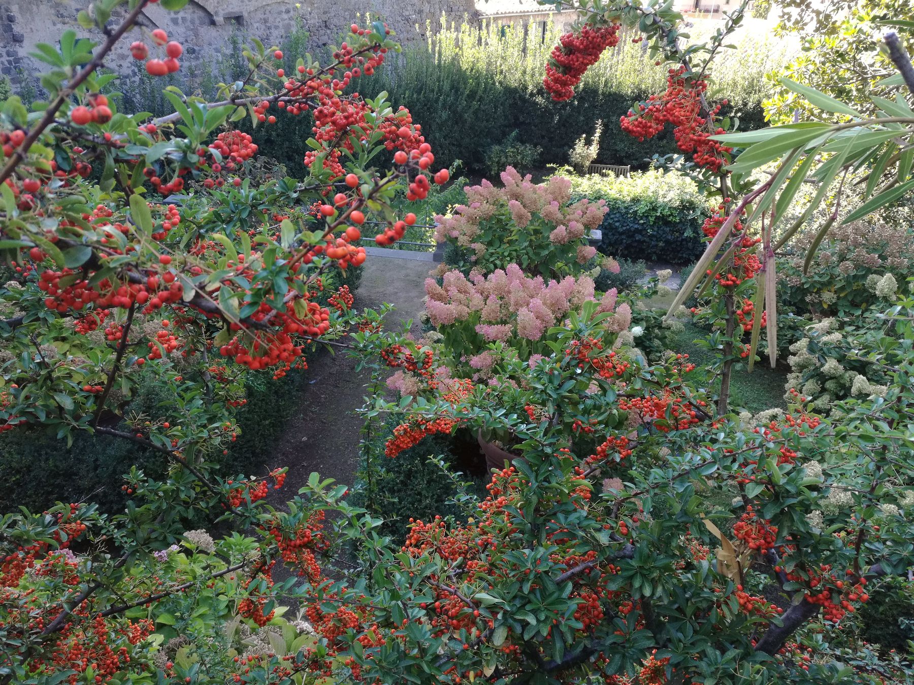 E’ un giardino di impianto formale, all’italiana, e la prima stanza che ci accoglie ha alte siepi di Taxus baccata potate come nei labirinti dei palazzi nobiliari.