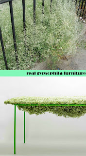 Sembrano proprio uguali il cespuglio di gypsophila lungo il marciapiede e il ripiano del tavolo nella foto sotto. Ed infatti il tavolo è costruito con veri rami di gypsophila: dalla pianta vera alla creazione di complementi d’arredo. E’ Harvest, la natura imbalsamata di Asif Khan, un progetto estremo che trasforma materie organiche, come le piante, in plastica indistruttibile, grazie a un procedimento di impregnazione, che prima elimina l’acqua contenuta nella pianta, poi grazie ai raggi UV e all’applicazione di una resina di semi di lino la rende dura ed integra strutturalmente. E voilà, come donare alla pianta un aspetto eterno … mi fa pensare al moderno desiderio ossessivo di voler “fermare il tempo”, di “non voler invecchiare”. Catturare la bellezza di una pianta o di un fiore e non farli MAI appassire: è un’idea seducente, inquietante e ambiziosa, che mi lascia a bocca aperta e mi fa riflettere. Voi che ne pensate?