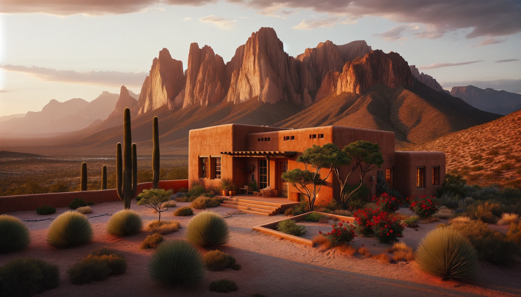 La casa, un edificio basso di adobe ( muro di mattoni ) si fonde armoniosamente con l’ambiente circostante, incorniciato dai maestosi Monti Rocciosi. La terra rossa del deserto sembra fondersi con le pareti della casa, creando un connubio visivamente affascinante.